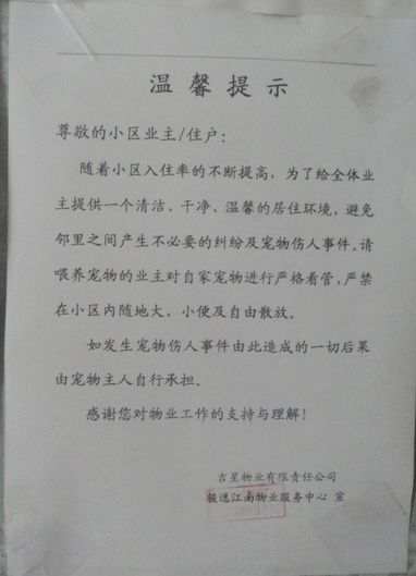 针对骏逸江南小区饲养宠物户增多,业主在饭后玩耍之时也成了遛狗的高峰期,为此,物业服务中心开展了“倡导文明养宠物,创建文明小区”活动,制作了文明养犬温馨提示,一方面为加强管理,同时也增大了宣传力度,大力倡导文明养宠物,携手共建和谐社区的良好氛围。