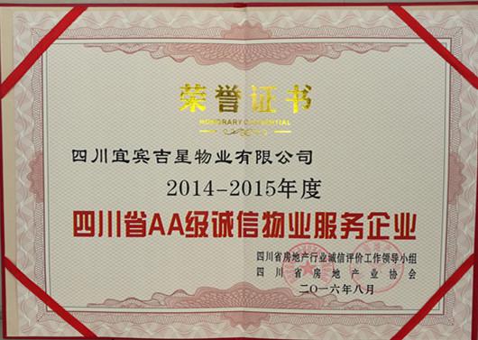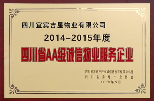 在一年一度四川省房地产行业诚信评价工作中,吉星物业荣获2014--2015年度AA级诚信物业服务企业称号。