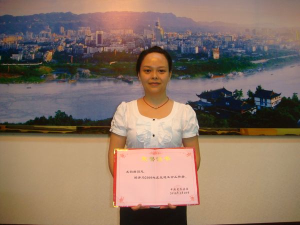 最后,集团工会领导还为荣获宜宾县2009年度工会工作先进个人龙韵珊颁发了荣誉证书,向被评为县级"工人先锋号"优秀单位"蓝天花园”、“翠柏商贸城"服务中心授旗。(敖德华 文/图)