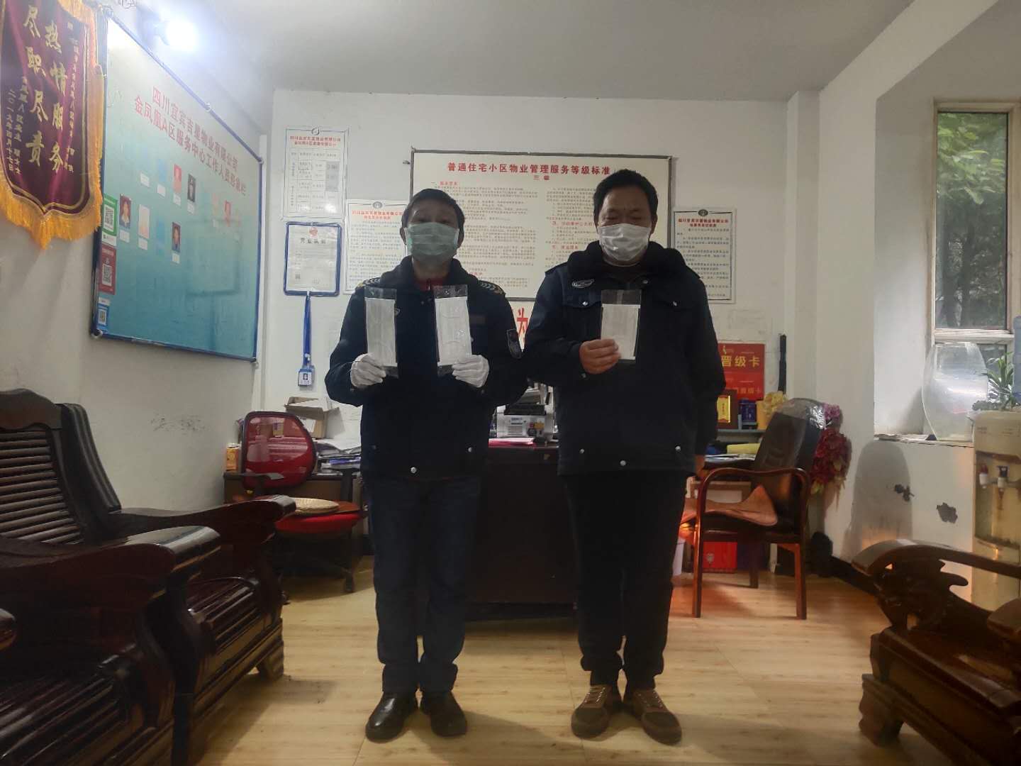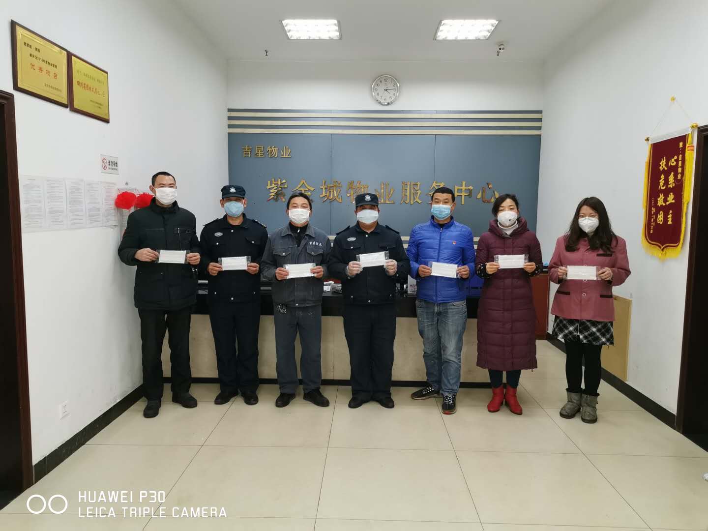“绝大部分的人天天在家隔离不出门,但物业不能,他们放弃休息,一直坚持在工作岗位上。”临港区房管局物业科肖科长表示,经过多方筹措,拿出了600个口罩、6把体温枪,送到了临港区吉星物业员工手上。“疫情就发生在身边,大家要共同面对。”肖科长说,物业人员都战斗在一线,防护用品就要用到真正缺乏、真正需要的人手中。”
